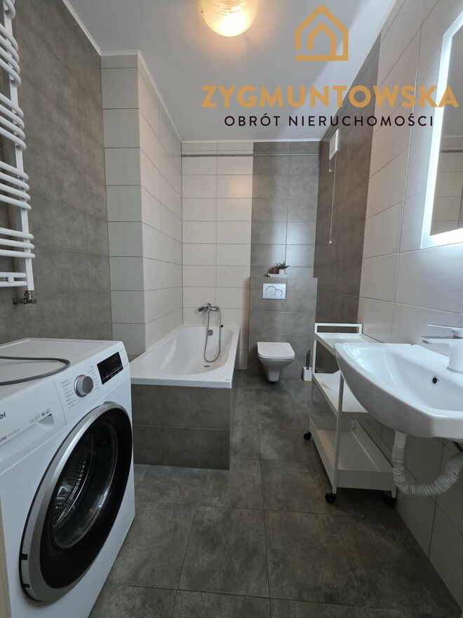Łazienka wyposażona w wannę, umywalkę z szafką, wc podwieszane, pralkę oraz lustro.